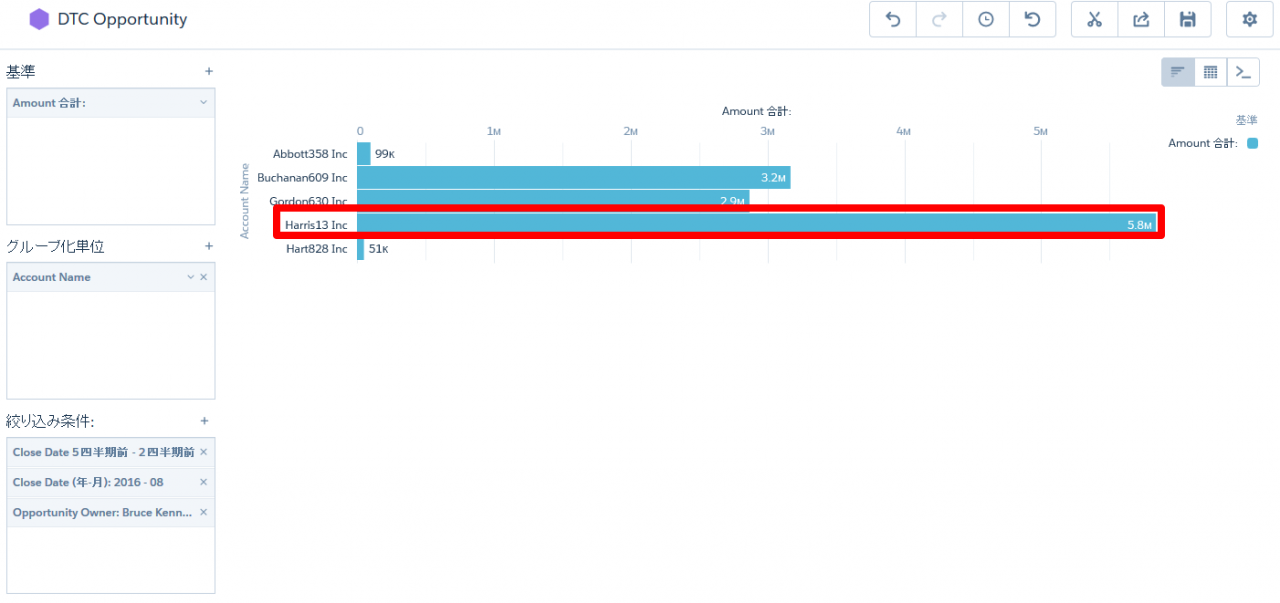 この結果からBruce Kennedyさんの2016年8月の商談金額はHarris13 Incが大きな割合を占めていたことが分かります。