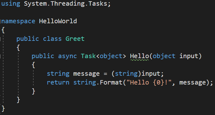 C# で Hello <文字列>を返す処理を作成し、 Javascript から引数 World を渡して C# 関数をコールします。