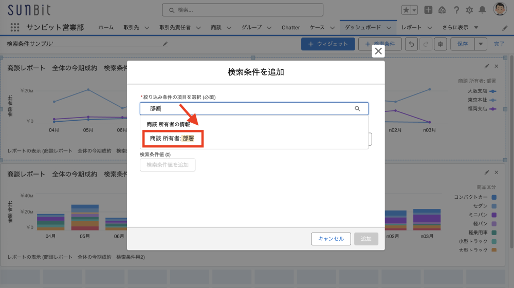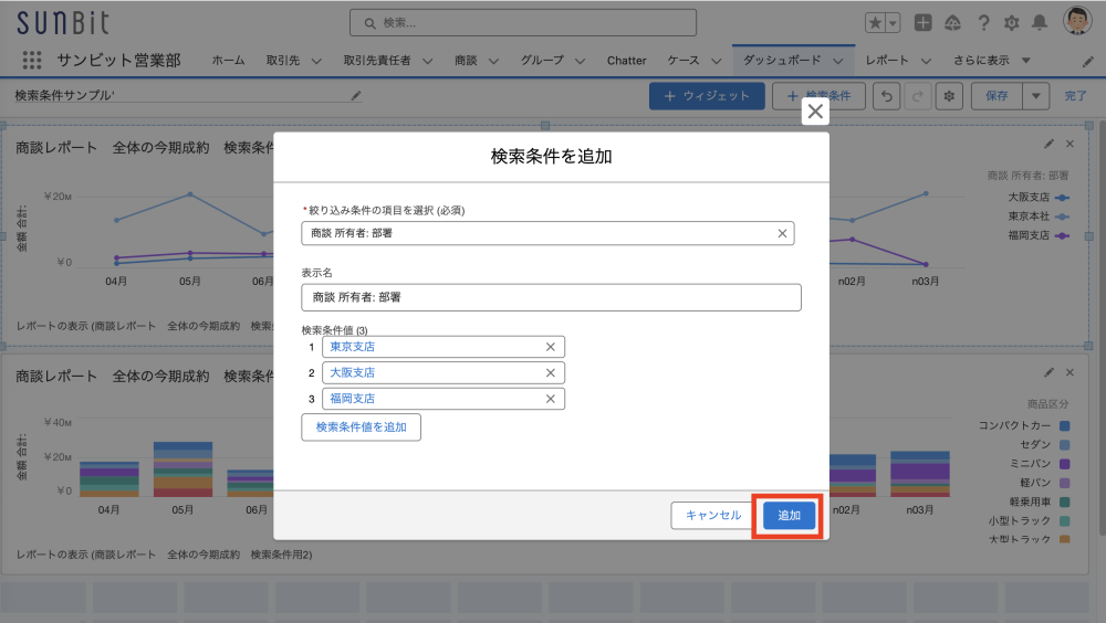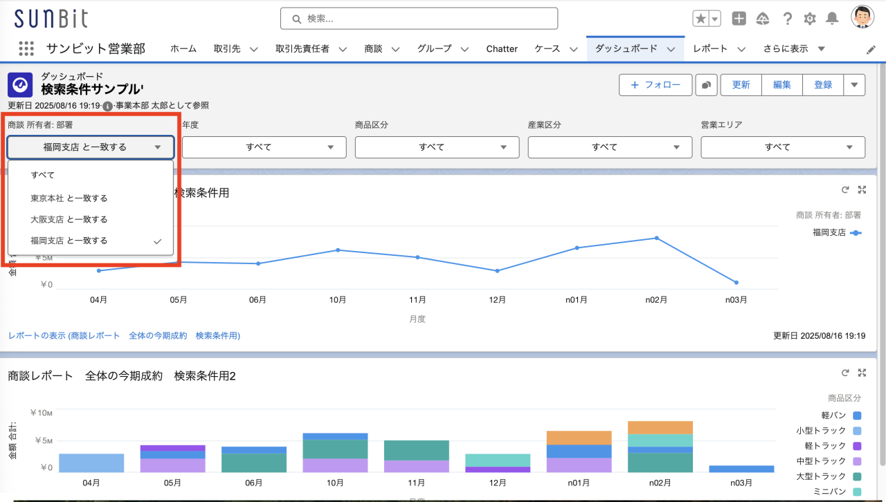 Salesforce のダッシュボードでは、大阪支店、福岡支店などの「支店」で集計結果を絞ったり、