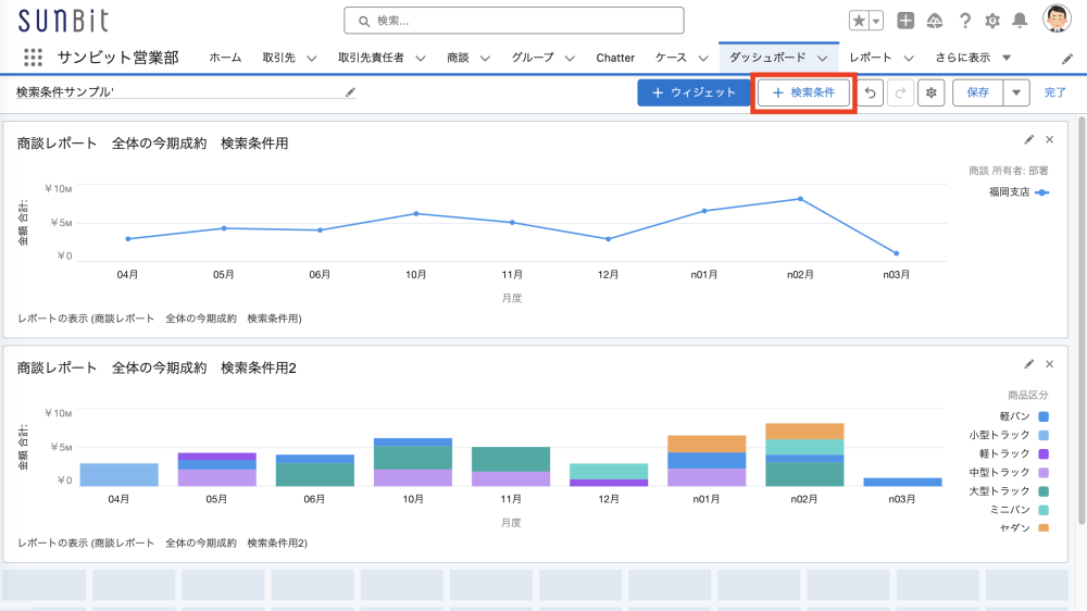 ダッシュボードに検索条件を追加するには、ダッシュボードを作成後に、編集画面で「+検索条件」をクリックします。