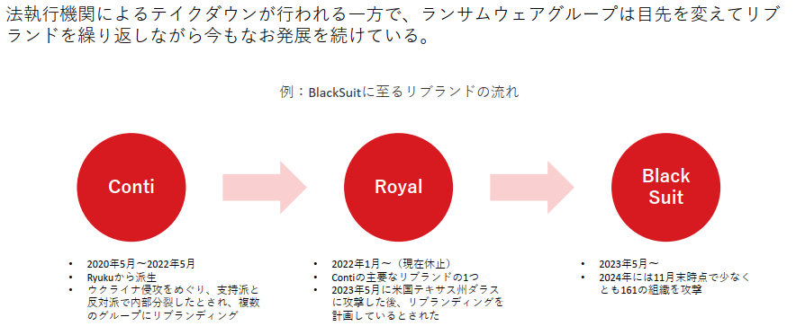 ⇒メール経由に加え、VPN経由、RDP経由(脆弱性攻撃、認証突破)やクラウド経由(社内サーバのクラウド移行時の設定ミス)などによる直接侵入が顕著化